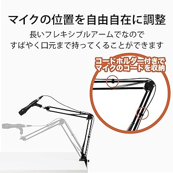 アームにはコードホルダーが付いているため、マイクのコードを収納して机まわりをすっきりさせることができます。