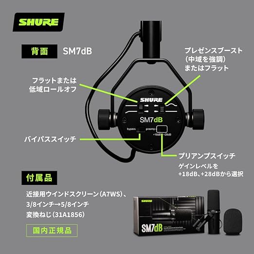 SHURE シュア ダイナミックマイク SM7dB プリアンプ搭載 : カーディオイド 単一指向性 XLR 有線 ストリーミング 配信 YouTube 音声 音楽 演奏 録音 レコーディング 実況 ゲーム ゲーミング ポッドキャスト ボーカル DTM 宅録 在宅 テレワーク 【国内正規品/メーカー保証2年】 a