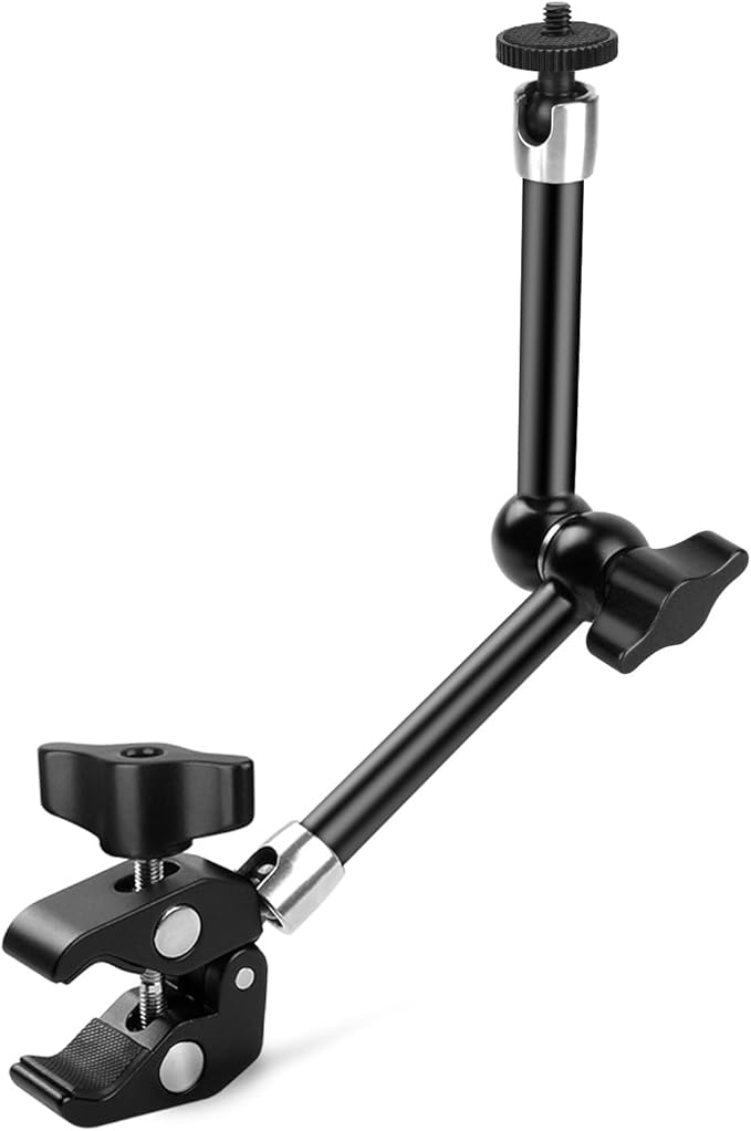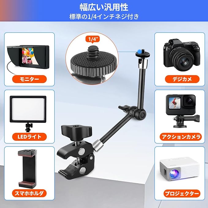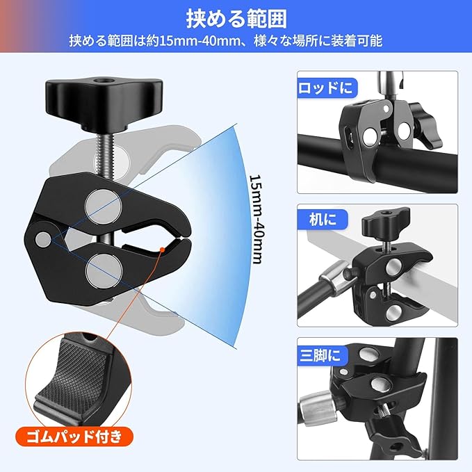 【緩み防止・安定性抜群】カメラアームのクランプとアームは取り外し不可ネジにより繋がっており、どんな方向でも安定して固定でき、緩むことを防止できます。アームの接続部はステンレス製の噛み合う歯車式デザインにより、固定力がアップします。さらに、滑り止めパッドにより、撮影機材に接続する時滑りにくくなっています。