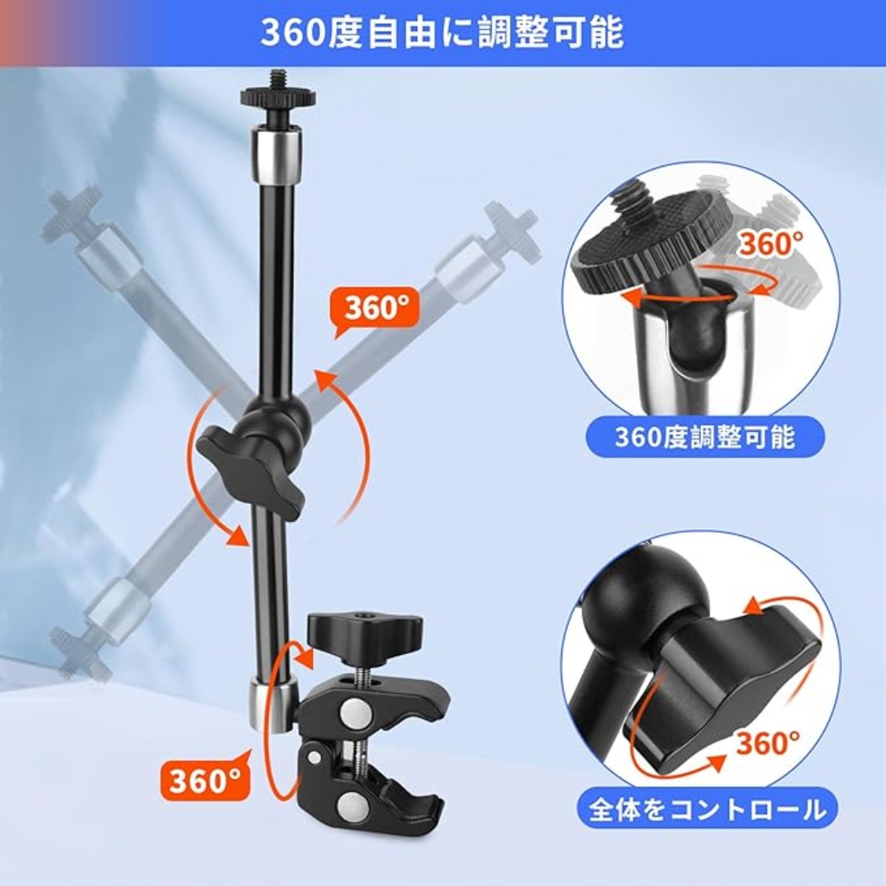 【360度回転・フレキシブルに調整可能】Webカメラアームの両端には360度回転可能なボールヘッドがあり、完璧な撮影角度を得ることができます。中央ノブだけですべての関節をコントロールすることが可