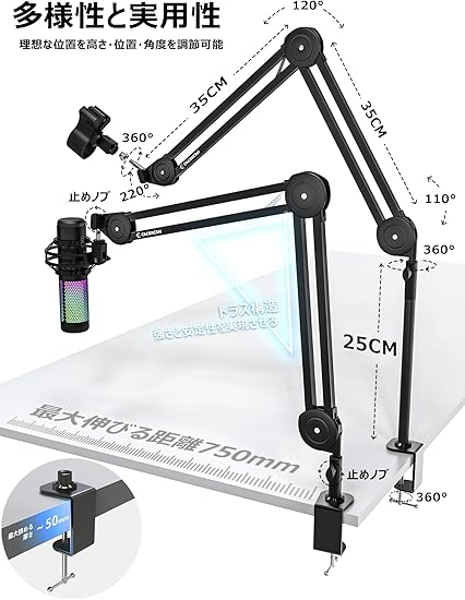 CACENCAN 【長く高くなる改良型】 M04 マイクブームアーム マイクアーム マイクスタンド アーム コンデンサー マイク用 ダイナミックマイク用 卓上マスタンド 耐荷重2.5kg 角度高さ調節 伸縮 実況 配信 収録 カラオケ 日本語説明書 a | PCBASE