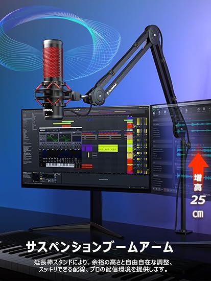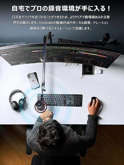 【3つ設置方法・真上から設置可能】独自研究開発の25cmアルミ制支柱が付属で、デスクの後方にこのマイクアー