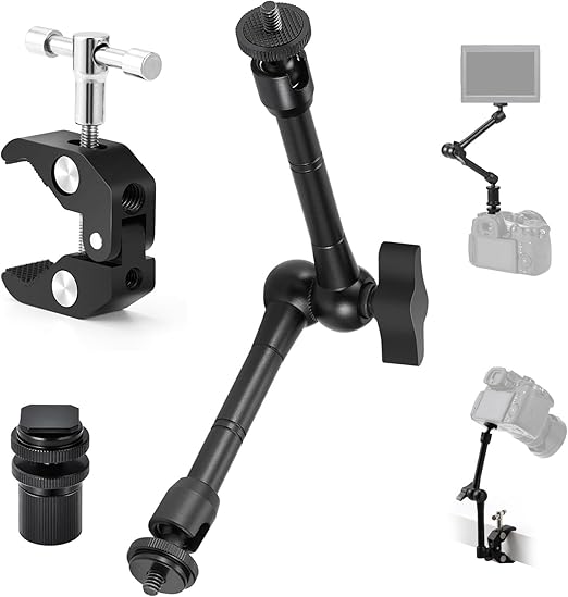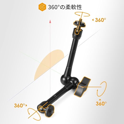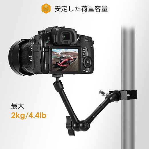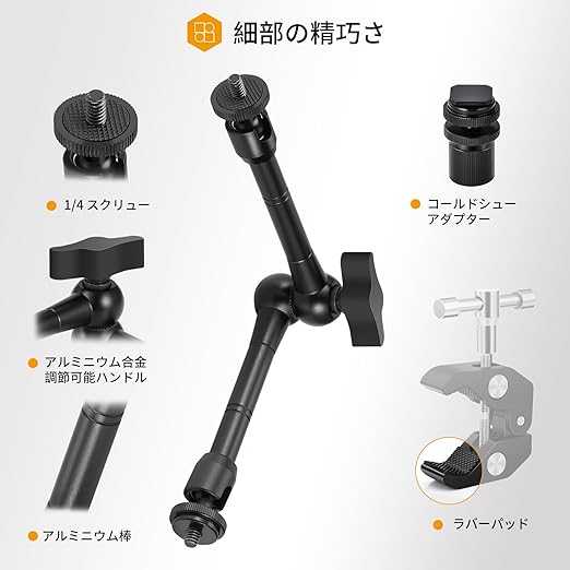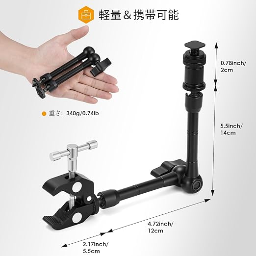 接続ポート: 1/4 および 3/8 インチネジ付きスタジオ クランプ + モニター、ビデオ ライト、マイク用の 11 インチ ビデオ/DSLR 関節アーム