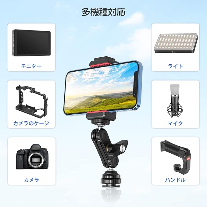 【コールドシューアダプター付き1/4"ネジ】アクセサリーを追加するための標準的なコールドシューと1/4ネジを備えています。シンプルな調整方法で、他の事をやりながら撮影し続けます。どの位置でもロックしやすいノブ付いていますので、いつでも落ち着く対応できます。小型L
