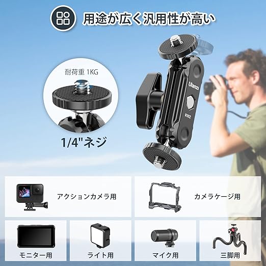 Ulanzi R102 マジックアーム 1/4ネジ ダブルボールヘッド Gopro用マウント付き アクセサリー 多機能ダブルボールアダプター 360°ボールヘッドマウント モニター/マイク/LEDライト/アクションカメラ/ビデオカメラ/ケージ/ハンドル/Goproに対応 アルミ合金製 耐荷重最大1kg 1個入り a | PCBASE