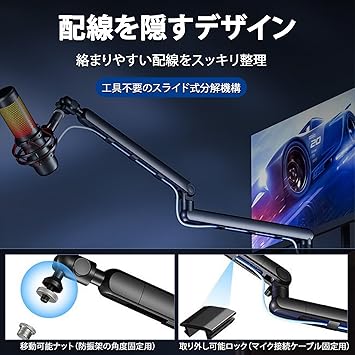 【広い可動域・角度自由調整】本製品は6つの関節と2つのアームで構成され、固定側のアームは360度の1軸方向、関節は360度/0~180度の2軸方向、ボールヘッド部は1方向に180度動くなど、可動領域が広いのスタンドとして、お好みの向き、高さを調節することができます。どんなに曲げでも安心してご利用いただけます。デスクを広く使ったり、マイクを見やすい位置に移動できたり、作業効率が上がります。