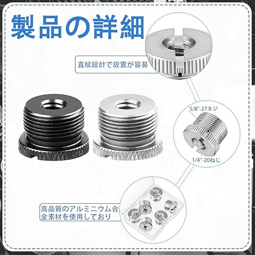 【商品仕様】2つのサイズが1/4“から5/8”の転換ねじ、外ねじは5/8”、内ねじは1/4”である。黒+銀色、高さ約12.5 mm。セット内容は4個入りで、複数の機材に対応できる実用的な設計です。