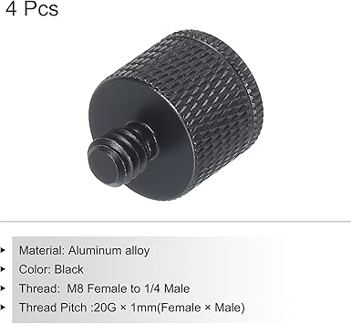 カメラネジのサイズ:材質:アルミニウム合金; カラー:ブラック; ネジ:M6メス-1/4オス; 合計サイズ:16 mm x 20 mm (D*H)