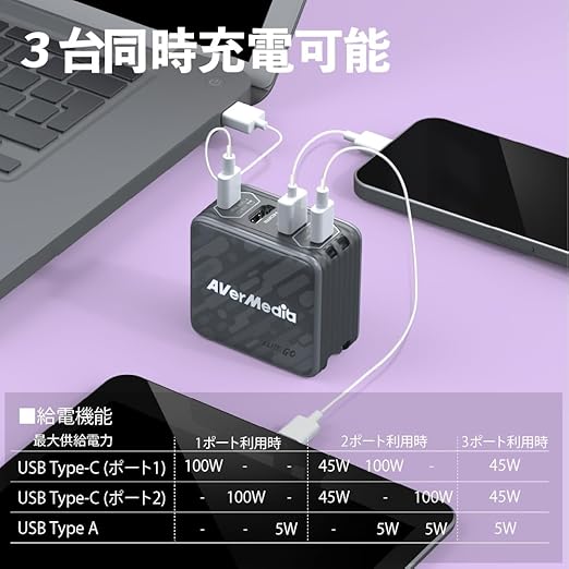 USB-Cポート2基とUSB-Aポート1基を搭載し、最大3台のデバイスを同時に充電可能です。省スペース設計で、複数の充電器を必要としません。