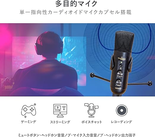 Mac/windows対応 多目的マイク – ストリーミング、Podcastコンテンツ作成(Garageband/Logic/Adobe Audition/Audacity対応)、Twitch/Skypeでの使用、YouTube動画作成や会議などにも理想的な高品質USBコンデンサーマイク