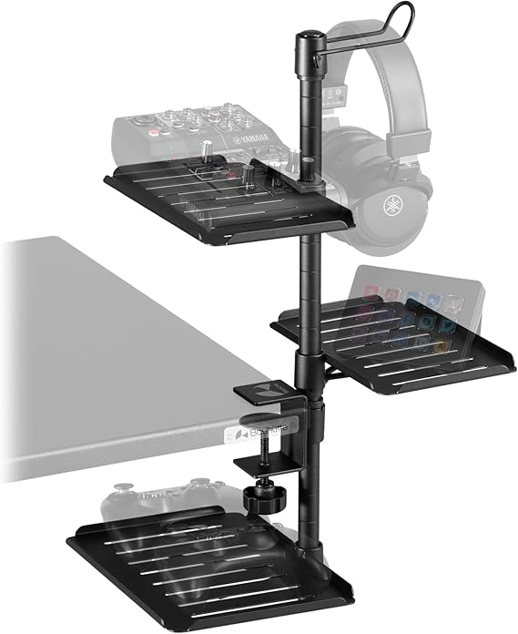 【デバイスを浮かせて収納】クランプ固定式の収納スタンドです。オーディオインターフェースなどの周辺機器3つ+ヘッドセット1つを、いつでもサッと手に取れるポジションへと配置可能です。