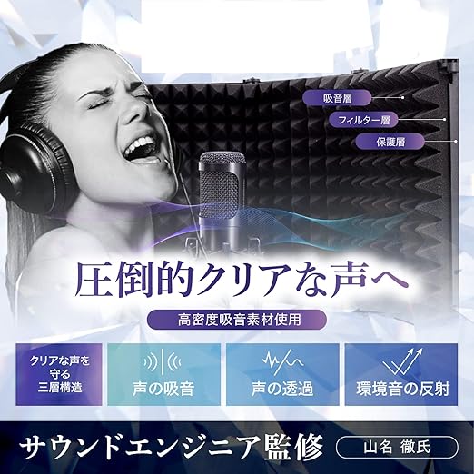 【圧倒的クリアな声へ】三層構造により声の 吸音 ・反響音の低減・環境音の反射を実現。「クリアな声」を守り、理想的な 録音 ・ レコーディング 環境を整えます!