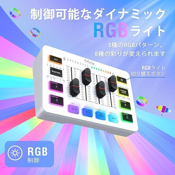 FIFINE ゲーミングオーディオミキサー オーディオインターフェース PC/PS4/PS5対応 ゲーム用オーディオミキサー ポッドキャスト ミキサー RGB機能付き ボイスチェンジャーボタン カスタム効果音 配信 実況 白 ミキサー FIFINE AmpliGame SC3W a