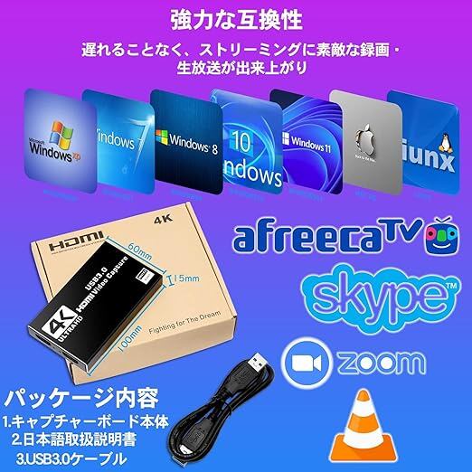 【1080P 60fpsに更新され】最大入力解像度:3840x2160 @ 60Hz、最大出力/録画解像度:1920x1080 @ 60Hz。HD解像度ビデオ録画とストリーミングの高品質体験を保証するために、USB 3.0インターフェイスを採用し、1080p/60fpsの高品質で録画できます。遅れることなく、ハイテクチップが内蔵するため、HD素材出力から生成されたビデオが高画質を確保し、ストリーミングがよりクリアかつスムーズになります。