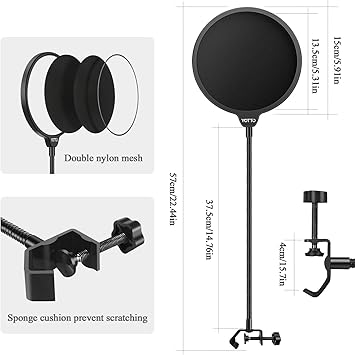 【特別設計のユニークなクランプ】-調節可能なグースネックとホルダー、ホルダーとネジの間のネジ接続穴にアップグレードされた厚みのあるデザインを採用し、剛性を高めています。 YOTTOは、強力で安定したクランプを備えたプロフェッショナルなポップスクリーンを設計し、ポップフィルターの自重による回転やフロップを完全に防止する市場で唯一の会社です。