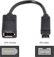 このアダプターは、Firewire 800ポートに差し込む9ピンオスコネクタを備えています。 アダプターのもう一方の端には、標準的な6ピンオスFireWire 400ケーブルに接続できる6ピンメスFireWireコネクタが付いています。