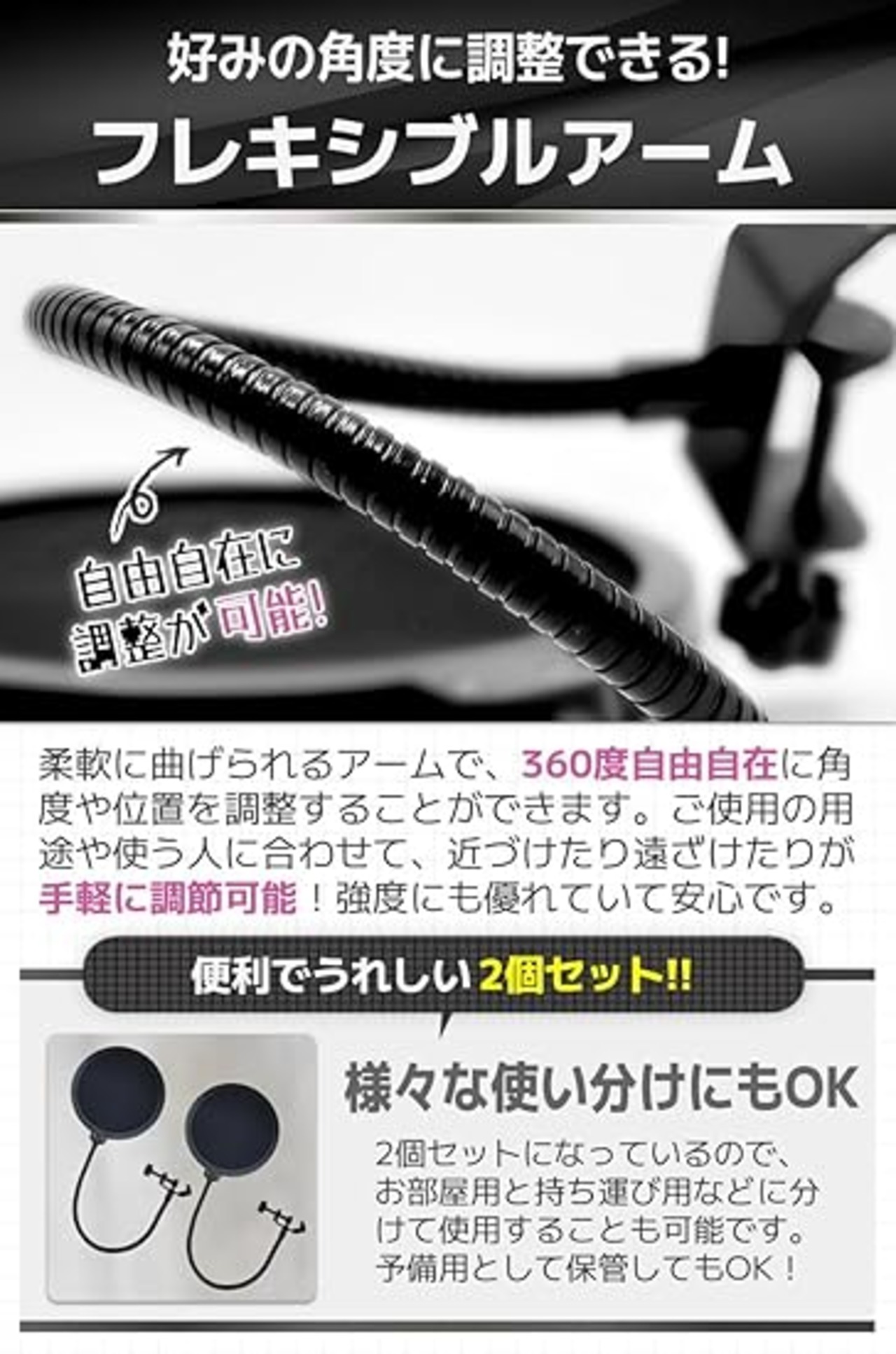 【フレキシブルアーム】柔軟に曲げられるアームで、360度自由自在に角度や位置を調整することができます。ご使用の用途や使う人に合わせて、近づけたり遠ざけたりが手軽に調節可能!強度にも優れていて安心です。