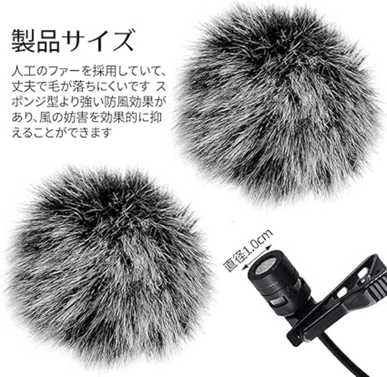 【ファー型】人工のファーを採用していて、丈夫で毛が落ちにくいです。スポンジ型より強い防風効果があり、風の妨害を効果的に抑えることができます。