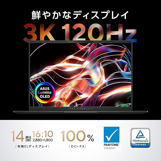 【OS】Windows 11 Home 64ビット【カラー】ニュートラルブラック【ディスプレイ】14.0型 OLED (有機EL)、グレア、2,880×1,800ドット (120Hz)【本体サイズ】幅310.5mm×奥行き221.9mm×高さ13.9~15.9mm 約1.3kg 【バッテリー駆動】約11.0時間 (動画再生時) ※JEITA測定法2.0【消費電力】最大約90W