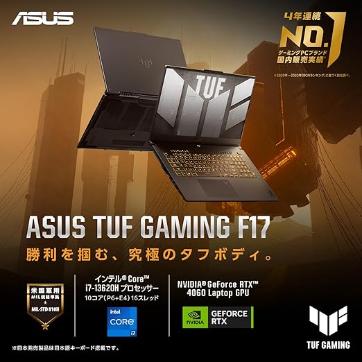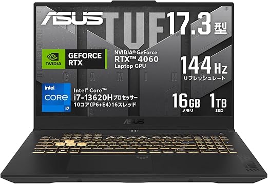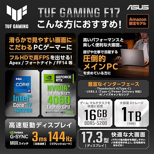 【Amazon.co.jp限定】 ASUS ゲーミングノートPC TUF Gaming F17 FX707VV 17.3インチ RTX 4060 インテル Core i7 13620H メモリ 16GB SSD 1TB リフレッシュレート144Hz RGB イルミネートキーボード Windows 11 動画編集 メカグレー FX707VV-I7R4060A5200 a