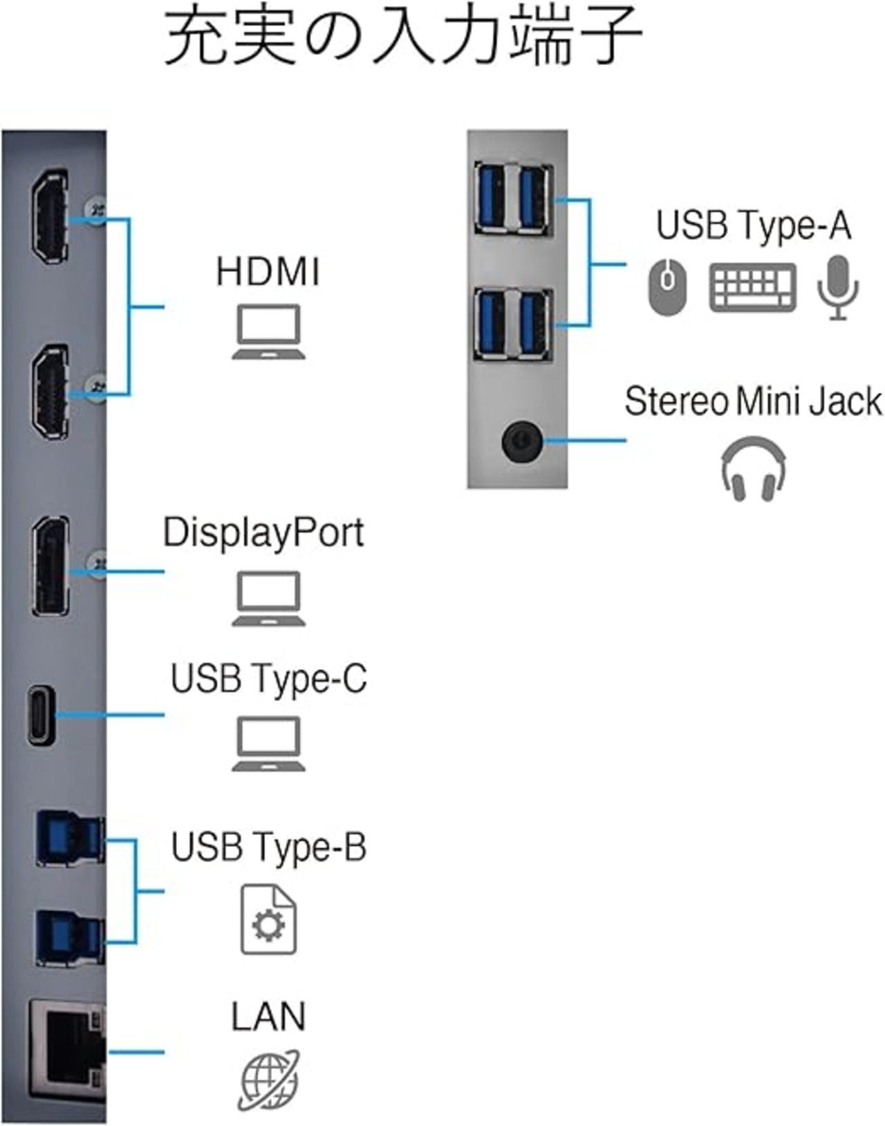 USB Type-C、DisplayPort、HDMI搭載、充実の映像入力端子でPCとの接続が容易