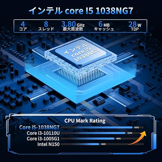 【i5-1038NG7搭載 & 360Hzリフレッシュレート】インテル クアッドコア i5-1038NG7(2.00GHz / 最大3.80GHz、4コア8スレッド)を搭載。N100(4コア4スレッド)やN150(3.4GHz)を大きく上回る高性能プロセ