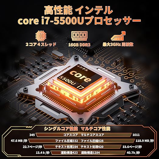 【パワフル インテルCore i7-5500U プロセッサー搭載+高速放熱冷却フアン搭載】ノートパソコンは IntelCore i7-5500Uプロセッサー搭載、最大3.0GHzまで達し、2コア4スレッドで動作し、高い処理能力を発揮します。大量のデータを処理する場合や、複数のタスクを同時に実行する場合でも快適に動作します!高性能で低消費電力pcです。ビジネス向けの高度な機能を備えているパソコン。高速の操作を実現しながら、発熱もちゃんと抑える高回転速の静音冷却フアンも搭載されているため、熱による引