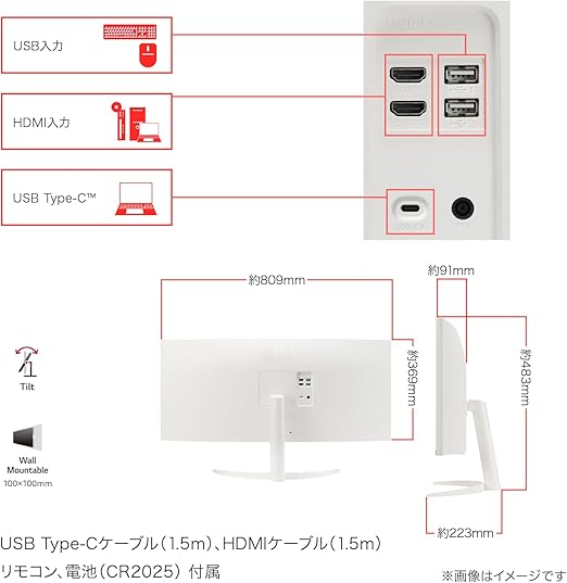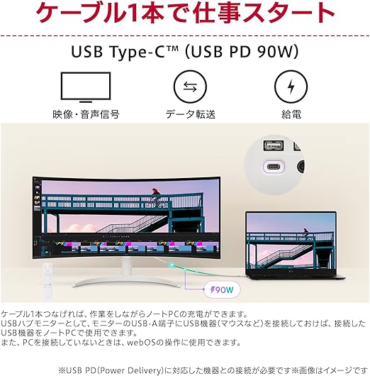 34インチ/21:9ウルトラワイド(3440×1440)/100Hz/USB Type-C(USB PD 65W)/sRGB 99%/HDR/アンチグレア/アイケアモード/フリッカーセーフ/ワイヤレス接続/AirPlay/Miracast/Bluetooh/HDMI/ケーブル付属(HDMI)/省エネモード/WebOS/ストリーミング/7W+7Wスピーカー搭載/リモコン付属/3辺フレームレス、スリムボディ