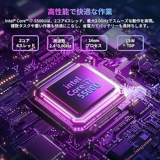 【安定したCPU + 大容量+core i7 ノートパソコン 14インチ 16gb 512gb】第5世代 i7-5500Uプロセッサーを搭載。最大3.0GHzの高い処理速度で、複数のアプリケーションを同時に起動しても素早く快適に動作します。16GBメモリと512GBの大容量ストレージで、データの保存も簡単です。