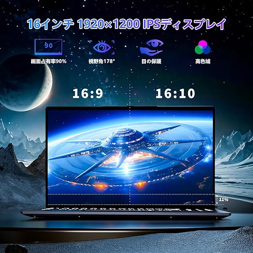 【16インチ FHD IPS & 長時間バッテリー】ノートパソコン16インチ フルHD IPSディスプレイで、息を呑むような映像を堪能してください。鮮やかな色彩と広い視野角により、映画、ブラウジング、仕事など、あらゆる場面で素晴らしい視覚体験を提供します。16:10のアスペクト比と100% SRGBカラーの幅広い範囲に対応。HDピクセル数に加え、エッジツーエッジの狭額縁ディスプレイにより、どこからでもより多くの情報を見ることができ、並外れた視覚体験をもたらします。ピクセル密度が高く、より鮮明で詳