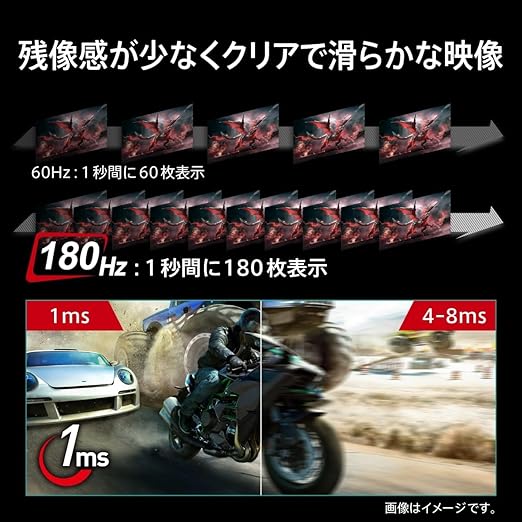 最大リフレッシュレート:180Hz・応答速度:1ms(MPRT)・パネル駆動方式:VA・表面タイプ:ノングレア