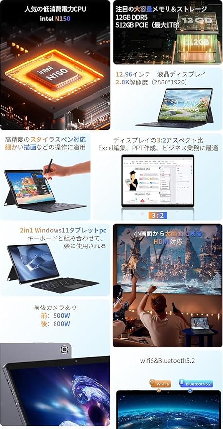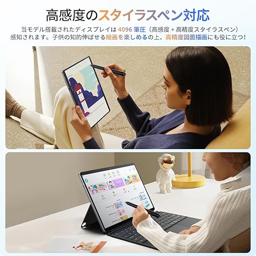 ご注意:キーボードとぺんは別途購入する必要があります。 【大容量DDR5 12GB+ 512GB SSD】12Gメモリ迅速な処理速度,クロック数4400MHzを内蔵するほか、512GBのSSDを内蔵し、起動とデータアクセスを高速化。複数のアプリケーションを同時に開いても、動作が滞りなく、高速処理できますまた、SSDストレージはHHDと比べて読み書き速度が5倍以上アップしています。