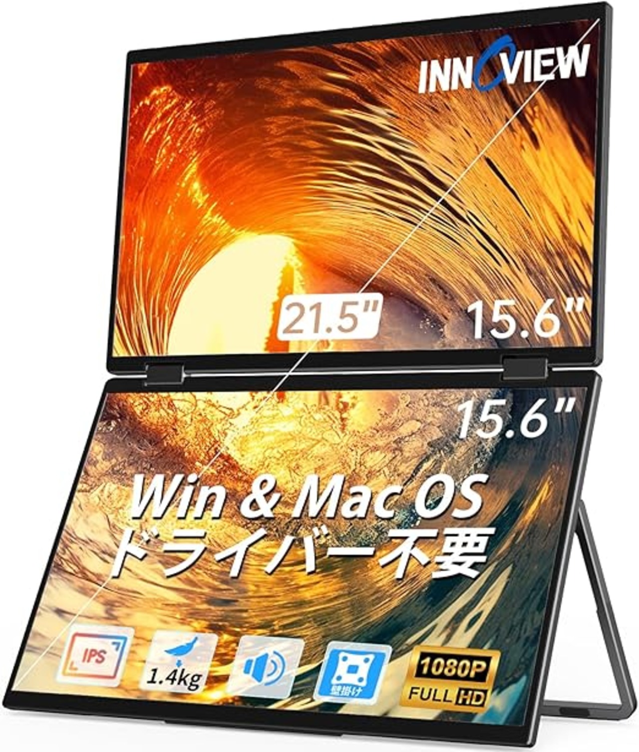 InnoView デュアル モバイルモニター 15.6インチ ドライバー不要 モバイルモニター2画面 FHD1080p 折りたたみ式デュアルディスプレイ モバイルディスプレイ 自動回転315° フル機能Type-C*2 標準HDMI IPSパネル 壁掛けに対応 自立スタンド付き(PC・Mac対応、ブラック) a