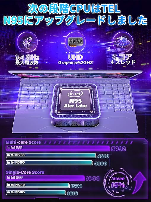 ノートパソコン【MS Office 2019/Win 11Pro】16インチ2.5K FHD(2560x1600) IPS 高速静音CPU Celeron N95 1.7-3.4Ghz/メモリ:DDR4 16GB Webカメラ/USB 3.0*2/mini-HDMI/SSD拡張 Webカメラ付き/顔認証/7色のバックライト付きキーボード マウス付き (高速SSD:12+960,パープル)… a