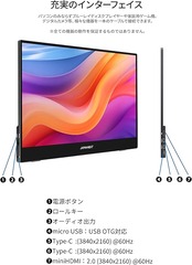 15.6インチのIPSパネルを搭載した、4K(3840x2160)解像度のモバイルモニターです。4Kは、フルHD(1920×1080)解像度の約4倍の作業領域を実現する3840×2160ドットの解像度となり、高精細な表示を実現できます。10点マルチタッチに対応したタッチパネルを搭載し、画面のスクロールや写真のピンチズームなど、直感的に画面の操作を行うことが可能です。