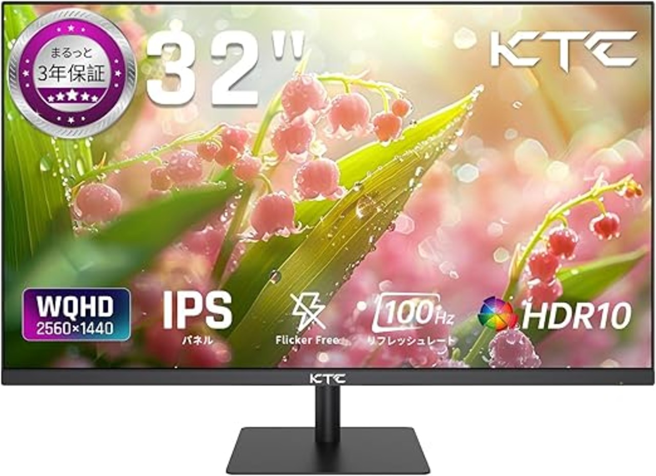 KTC 32インチ モニターQHD 100Hz 2K IPSワイド画面 省スペース設計 PS5対応 アイケア機能 VESA対応 フリーシンク/Gシンク HDMI 2.0×2, DP 1.4×1 スピーカー対応なし 3年保証 H32T13 a | PCBASE