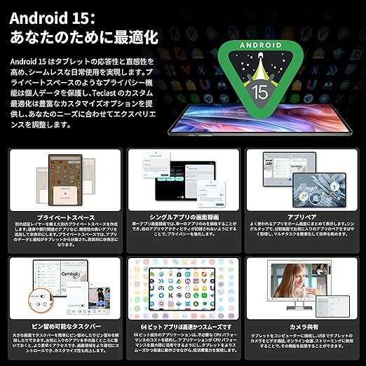 【Android 15 タブレット13インチ初登場】TECLAST T65MAX 13インチタブレットは最新Android15OSを搭載し、64ビットAPPアプリケーションに深く最適化され、起動と応答速度が向上しています。 また、弊社の二次開発では、システムUIの一部が改善・最適化され、より多くのサードパーティ製アプリケーションに適応し、システムインタラクションがよりフレンドリーで便利になりました。プライベートスペース:機密性の高いアプリやデータを見えないようにします。アプリのペア:最もよく使用