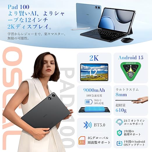 【Android 15 タブレット 12インチ・2K AIスマートタブレット・ケース付き、タッチペン付き】最新のAndroid 15 を搭載したOSCAL Pad 100 android15 タブレットは、現代のユーザー向けに設計される。利便性、創造性、効率性を兼ね備え、AI技術によってパフォーマンスが一段と向上している。作業効率を最大化し、データを安全に守り、個々のニーズに合わせた体験を提供する。①インテリジェントマルチタスク:・スワイプ1つでアプリ切り替え・分割画面同時操作・三本指スクリーン