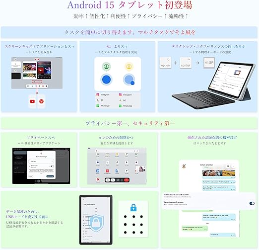 【Android 15 タブレット12インチ & Gemini AI搭載】Blackview MEGA2 タブレット androidは最新Android15 OSを搭載し、64ビットAPPアプリケーションに深く最適化され、起動と応答速度が向上しています。 また、弊社の二次開発では、システムUIの一部が改善・最適化され、より多くのサードパーティ製アプリケーションに適応し、システムインタラクションがよりフレンドリーで便利になりました。プライベートスペース:機密性の高いアプリやデータを見えないようにし