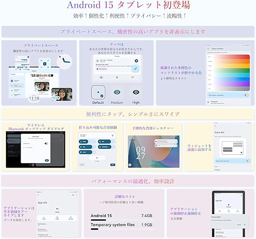 【Android 15 タブレット12インチ & Gemini AI搭載】Blackview MEGA2 タブレット androidは最新Android15 OSを搭載し、64ビットAPPアプリケーションに深く最適化され、起動と応答速度が向上しています。 また、弊社の二次開発では、システムUIの一部が改善・最適化され、より多くのサードパーティ製アプリケーションに適応し、システムインタラクションがよりフレンドリーで便利になりました。プライベートスペース:機密性の高いアプリやデータを見えないようにし