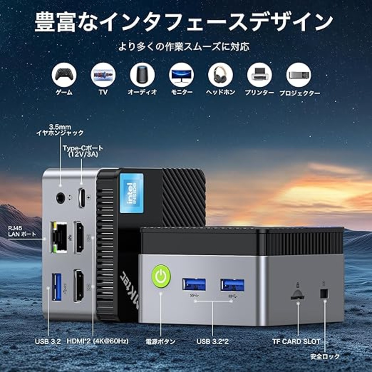 【N150より効率的な作業に、N97 GMKtec ミニPCが登場】[GMKtec NucBox G5] ミニpcは最新のインテル AlderLake-N97(最大周波数3.6GHz、4C/4T、6MBキャッシュ )プロセッサーを内蔵しており、メモリ/ストレージは12GB+256GBを搭載、マルチタスク処理や高負荷な業務アプリにもスムーズに対応。 n97みにpcは、従来のn150やn95 mini pcに比べて28%作業性能がアップされ。パワフルで、ホーム サーバー、学校教育、Webブラウジング