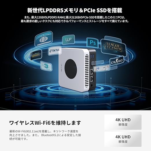 VESAマウントキットは付属しています。【DDR5 12GB+512GB SSD】を搭載したこのミニPCは、優れたパフォーマンスとスムーズな動作を提供し、遅延を減らして複数のタスクを同時に実行できます。また、M.2 2280 SATA3 SSDは最大1TB(別売)までストレージアップグレードもサポートしております。