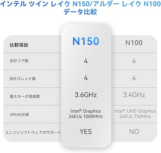 【Intel Twin N150 - Intel Graphics 1000MHz】Trigkey key n150 ミニコンピュータは、Intel Twin Lake N150 プロセッサ (4 コア、4 スレッド、6MB キャッシュ、最大 3.6 GHz、13W TDP) を使用しており、Intel N100 よりも 34% 高いパフォーマンスを実現します。 24 EU を備えた 1000 MHz インテル グラフィックスに PC とデバイスを完全に接続できます。これは、750 MHz のイ