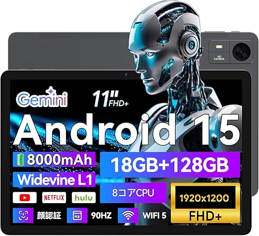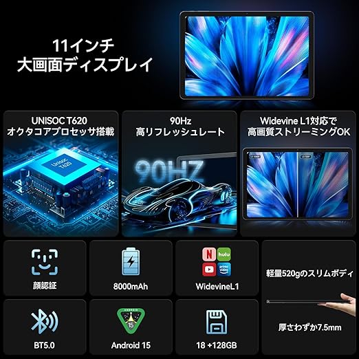 FPD 11インチ タブレット FHD+ Android 15 90Hz、1920x1200 IPS 8コアCPU UNISOC T620 18GB RAM+128GB+512G拡張、8000mAh 大容量バッテリー 、Type-C 18W 急速充電 2.4G&5G Wi-Fi +Bluetooth5.0 デュアルカメラ 5MP+13MPカメラ+顔認識+Widevine L1対応 a | PCBASE