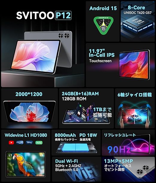 【専用ケースプレゼント】wi-fiモデルタブレット 12インチ Android15 2K 24GB+128GB 90Hz 6軸ジャイロ 2.2Ghz T6208コアCPU WidevineL1 高性能 SVITOO P12 2000*1200 gps搭載 fhd IPS大画面 8000mAh 急速充電 4つスピーカー 顔認識 画面分割 無線投影 tablet 視聴/ゲーム向け 2025 a | PCBASE