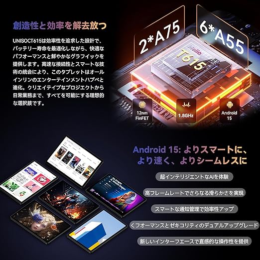 最新Android 15タブレット 10インチ Wi-Fiモデル:WPad6は最新のAndroid 15を搭載し、ユーザー体験を革新するために多くの新機能を搭載しています。マルチタスク処理が向上し、アプリ間の切り替えがスムーズになり、効率的に作業を進めることができます。また、セキュリティとプライバシーが強化され、アプリの権限管理やプライバシー保護がさらに詳細に設定可能です。バッテリー管理機能も改善され、長時間の使用が可能に。さらに、Wi-FiやBluetoothの接続性能が向上し、より安定した通
