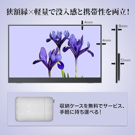 【持ち運び自由】本体重量735g(スタンド含む)・最薄部8mmの軽量筐体。ビジネスバッグの隙間にも収まるコンパクトサイズで、持ち運びに最適です。ベゼル幅は上部と左右で5mmと細く、マルチディスプレイ環境でも違和感なく使用できます。収納用ケースも付属しており