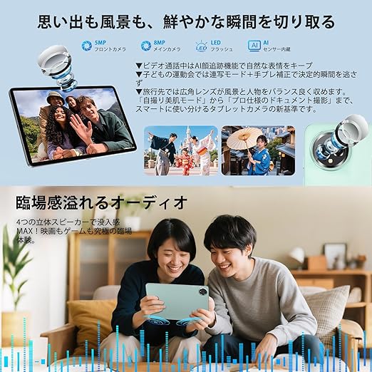 【高性能T606 8コアCPU&12GB+128GBストレージ】Unisoc T606オクタコアプロセッサーを採用したAzeyou 10インチ タブレットは、1.8GHzの高性能A75コア2基と1.6GHzの高効率A55コア6基を搭載、12nmプロセス技術で低消費電力化を実現しました、またG57グラフィックプロセッサーが強力な映像処理性能を発揮します。4GB実メモリプラス8GB仮想メモリで合計12GBの大容量メモリを実現、128GB内蔵ストレージに加え、micro SDカードで最大1TBまで拡張