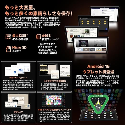【Android 15 タブレット 10インチ Wi-fiモデル】12GB+64GB+2TB TF拡張、アンドロイド タブレットWidevineL1+GMS認証+Type-C充電+6000mAh、薄型軽量 1280*800 TDDI Incell IPS画面、WiFi6+BT5.0+OTG+画面分割+重力センシング+無線投影 日本語説明書付属 bmax a | PCBASE