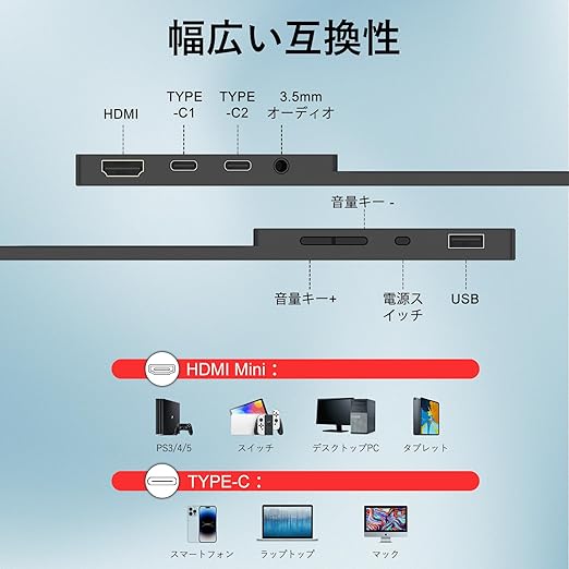 【購入前に必ずご確認ください!】注意:①Apple製デバイスはワンタッチのみ、Apple製以外のデバイスはマルチタッチに対応 ②HDMI接続はタッチ機能に非対応 ③タッチ機能を使用するには、デバイスをType-Cポートにのみ接続し、デバイスがUSB-C 3.1以上のプロトコルに対応している必要があります。